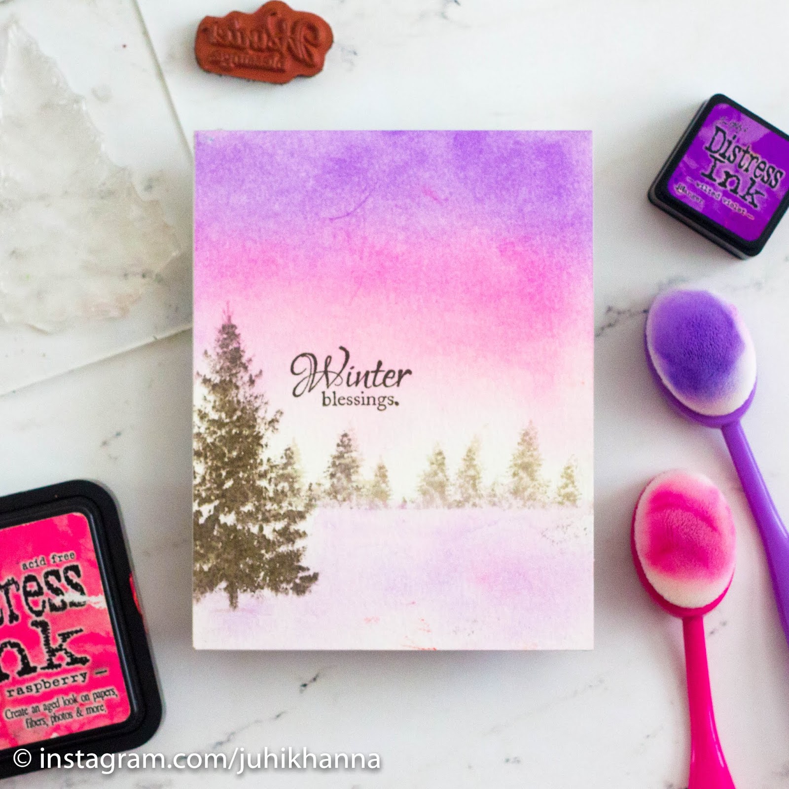 For my first card, I stamped the trees with Gina K inks on watercolor paper and created background with Taylored Expressions Blender brushes. I ran over the ink blended sky with a wet brush for the watercolor look. I also went over the trees with a wet brush to soften the colors. The sentiment is from the Winter Blessings set from Unity Stamps.